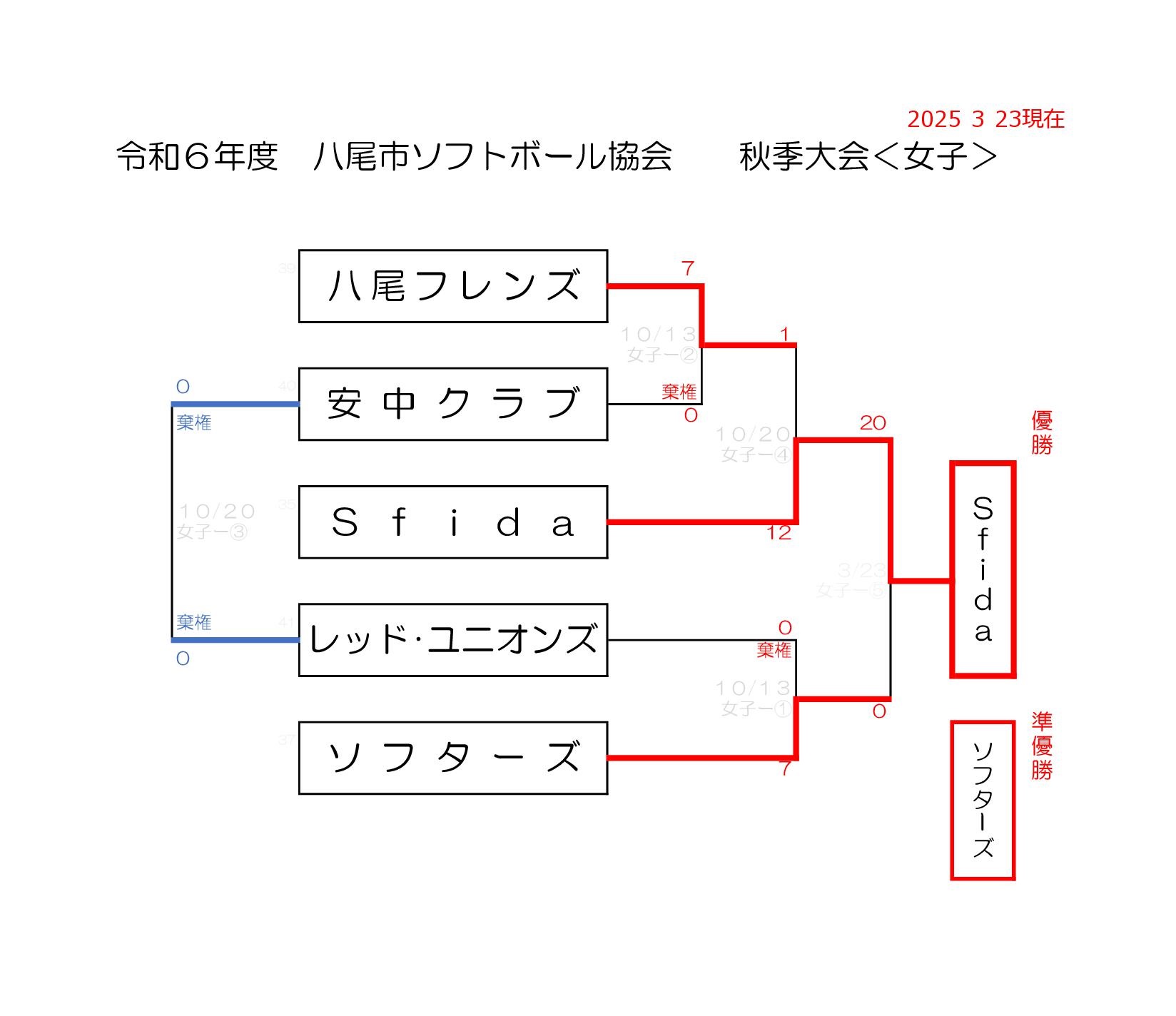 2025年5月12日 / 最終更新日時 : 2025年5月12日 yao-soft 一般女子 令和6年度 秋季大会 女子の表彰式の写真です。 遅くなりましたが、3月23日に令和6年度秋季大会女子の表彰式の写真をアップします。優勝:Sifda準優勝:ソフターズMVP:Sfida 本村愛美選手 ※画像が変わっていない方は、キャッシュを削除するかshift+F5で最新を取得して下さい。