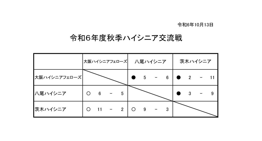 2024年10月14日 / 最終更新日時 : 2024年10月14日 yao-soft シニア・ハイシニア 令和6年度ハイシニア交流戦の結果です。(10/13) 10月13日(日)に行われた、ハイシニア交流戦の結果です。