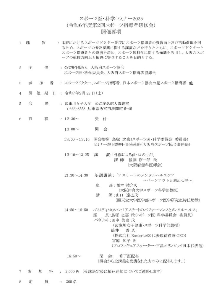 令和7年2月22日(土)に、武庫川女子大学 公江記念館 大講義室にて「令和6年度大阪スポーツ医・科学セミナー2025」が開催されます。