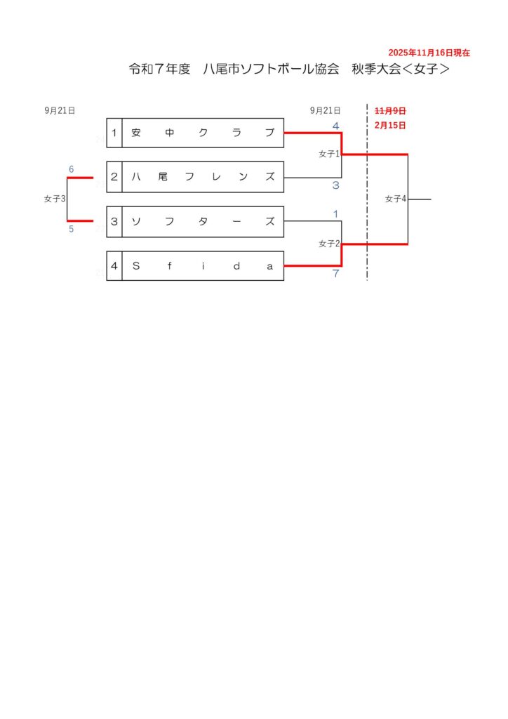 2025年11月19日 / 最終更新日時 : 2025年11月19日 yao-soft レディース 令和7年度 秋季大会 女子の日程が決まりました。〔11/16現在〕 順延となっていました日程が決まりましたのでお知らせします。