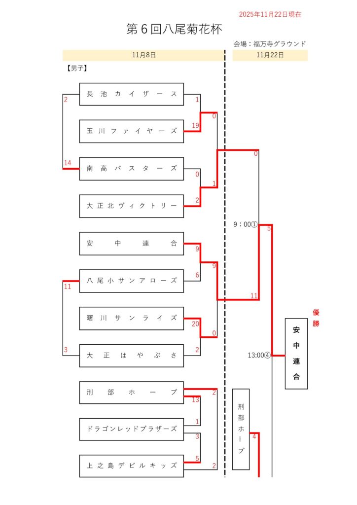 2025年11月26日 / 最終更新日時 : 2025年11月26日 yao-soft 八尾市ソフトボール協会 第6回八尾菊花ライオンズクラブ杯の結果です。〔11/23現在〕 第6回八尾菊花ライオンズクラブ杯の試合結果です。女子 優勝:南高スターズ準優勝:久宝寺ミラクルえ男子優勝:安中連合準優勝:刑部ホープおめでとうございます。(^_^)