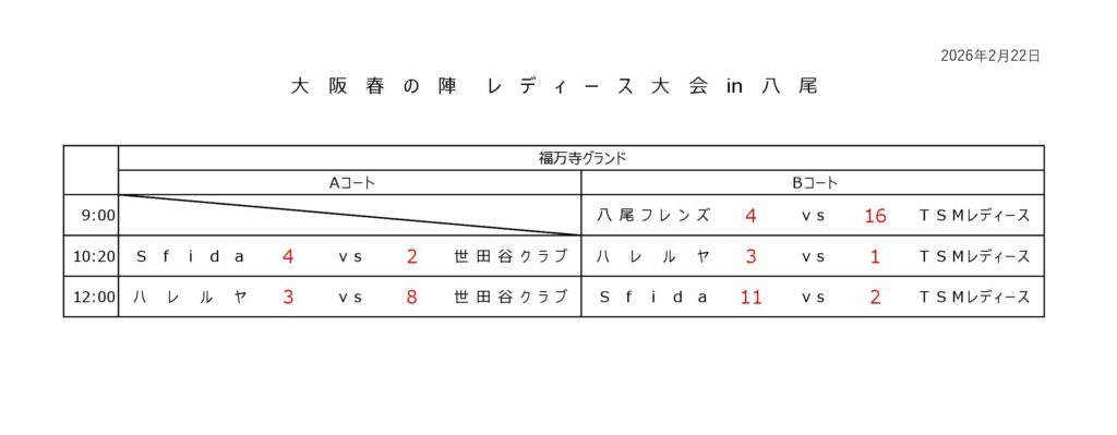2026年2月23日 / 最終更新日時 : 2026年2月23日 yao-soft レディース 第3回大阪春の陣レディース大会の結果です。 2月22日(日)、大阪春の陣レディース大会が福万寺グランドで開催されました。結果と、当日の写真は少しですがUPします。