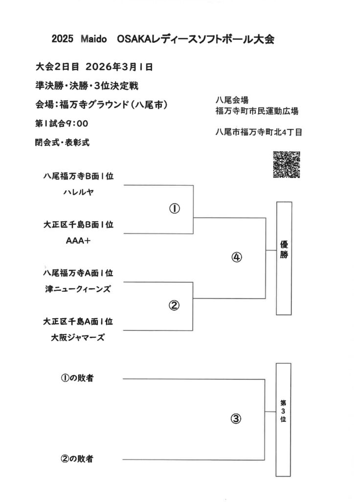 MaidoOSAKA レディース・シニアソフトボール大会の組み合わせです。